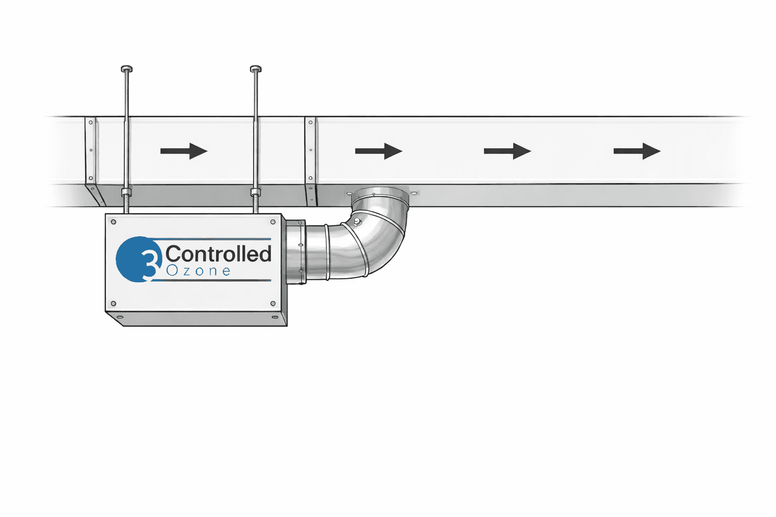 The system injects controlled ozone into the extract duct where it reacts with odorous compounds, with interlocks ensuring generation only occurs under safe airflow conditions.