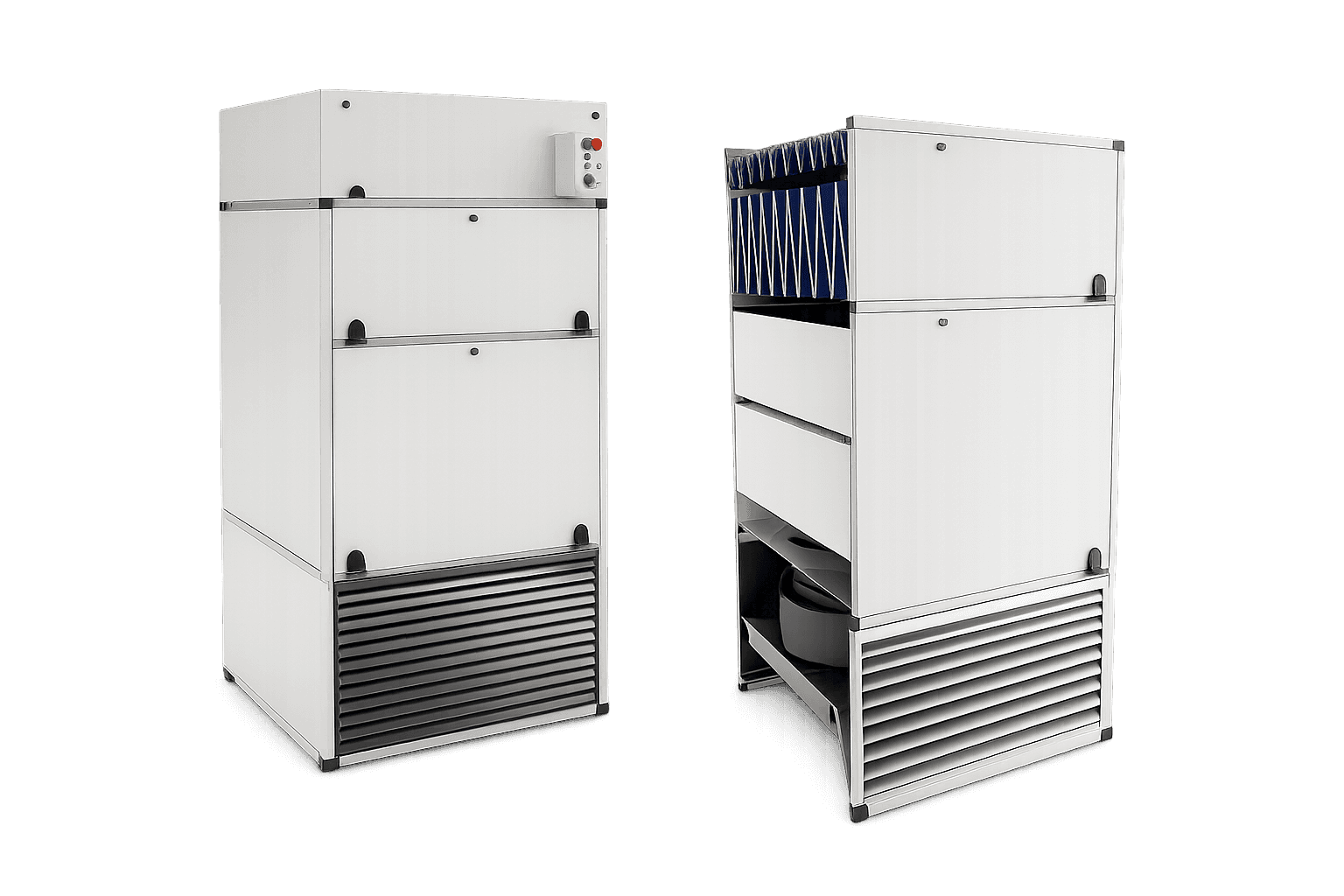 Air passes through primary grease filters before moving through multiple high-efficiency filtration stages where grease, fine particulates and odours are progressively removed. The cleaned air is then safely recirculated back into the kitchen environment, delivering effective air treatment with controlled airflow resistance and reliable performance.